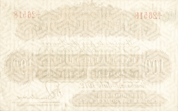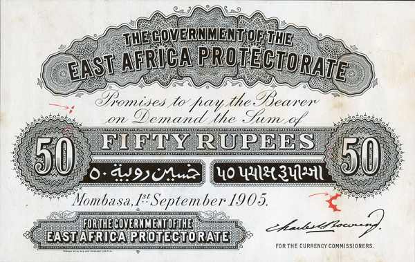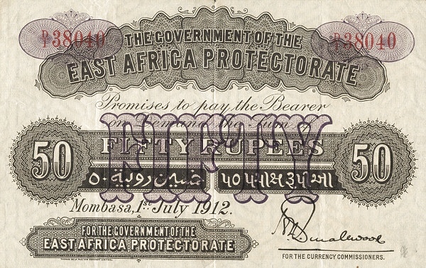 BEARER ON DEMAND THE SUM OF / 50 FIFTY RUPEES 50 / MOMBASA 1st JULY 1912 / FOR THE GOVERNMENT OF THE EAST AFRICA PROTECTORATE