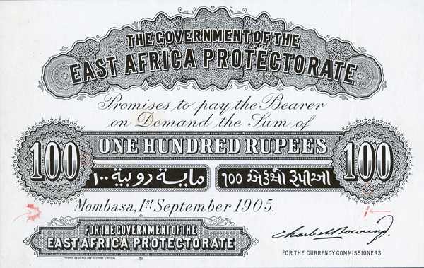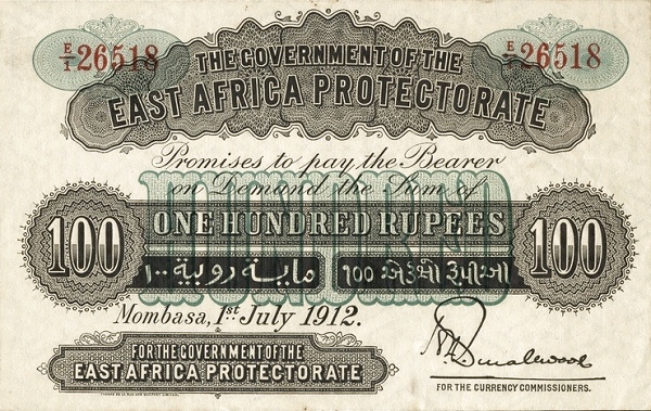 BEARER ON DEMAND THE SUM OF / 100 ONE HUNDRED RUPEES 100 / MOMBASA 1st
