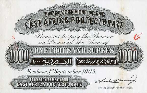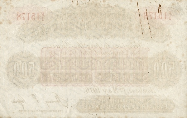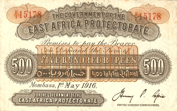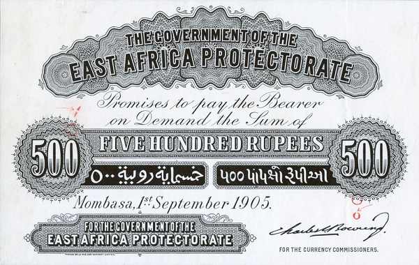 BEARER ON DEMAND THE SUM OF / 500 FIVE HUNDRED RUPEES 500 / MOMBASA (date) / FOR THE GOVERNMENT OF THE EAST AFRICA PROTECTORATE